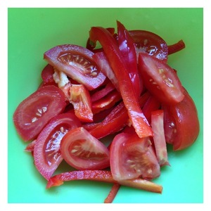 Брокколи отварить в подсоленной воде минут 7, затем откинуть на дуршлаг и обдать холодной водой. Дать стечь лишней жидкости. Помидор нарезать полупластинками, перец соломкой.
