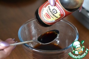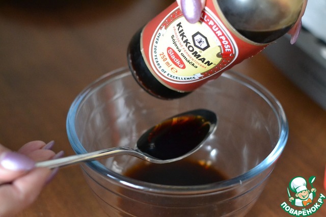 Смешать соевый соус "Киккоман", сахар, винный уксус, воду и крахмал.
