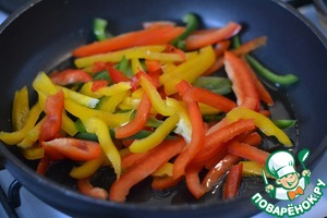 • Перцы нарежем на полосочки. Чили перец на маленькие кусочки.