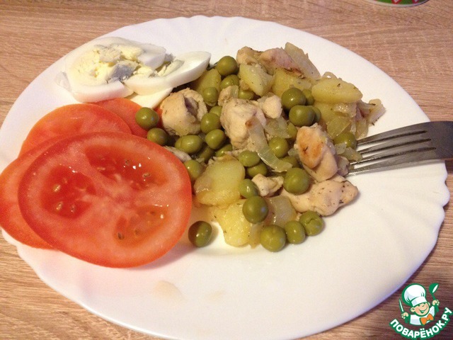 Выложить на тарелку, добавить горошек. Сбрызнуть уксусом (при желании) и перемешать. Готовое блюдо украсить дольками свежего помидора и вареным яйцом. Приятного аппетита!
