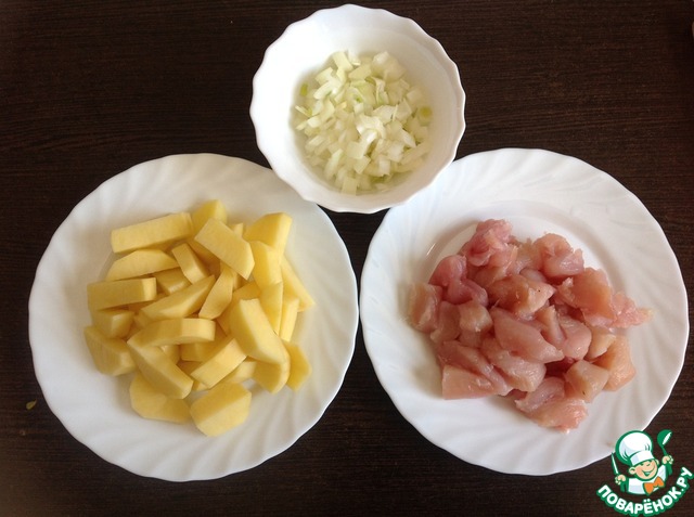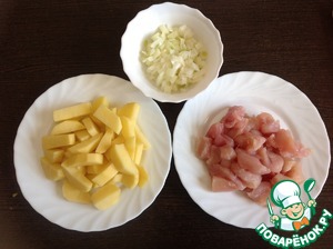 Репчатый лук очистить, мелко нарезать. Куриное филе обмыть, обсушить, нарезать небольшими кусочками. Картофель, помыть, очистить и нарезать ломтиками.