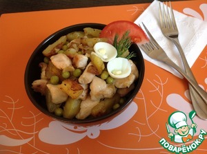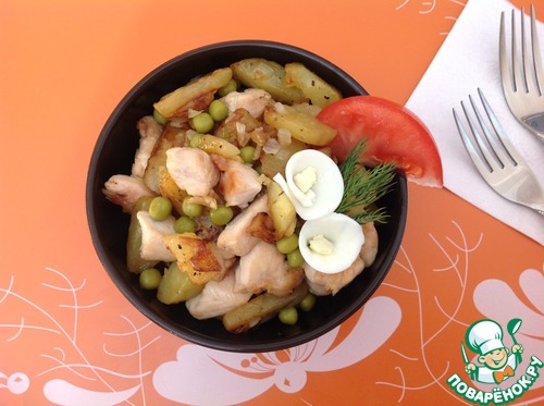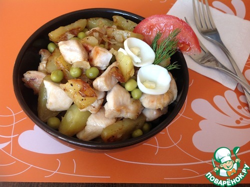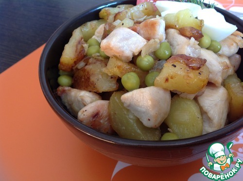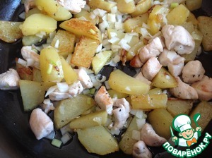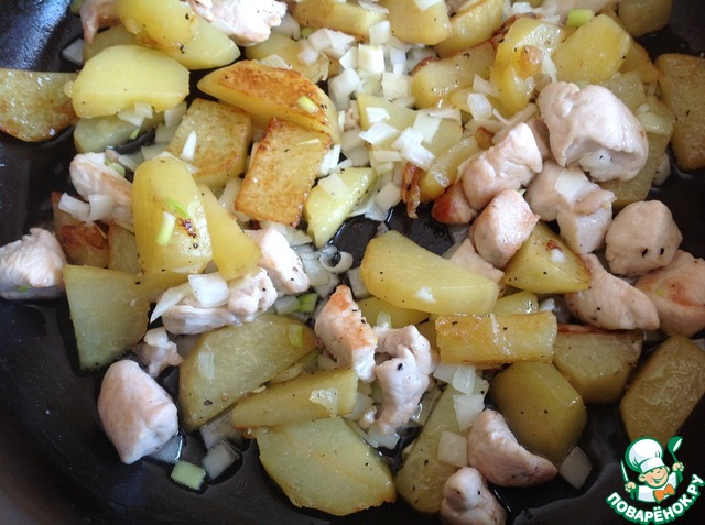 В сковороде разогреть масло, добавить курицу и картофель и жарить до полуготовности на среднем огне. Затем добавить лук и жарить до готовности. Посолить и поперчить по вкусу.