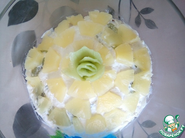Консервированный ананас порезаный тонкими ломтиками укладываем сверху.
