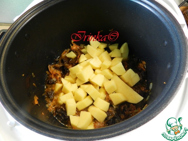 Затем кладем картошку, нарезанную средними кубиками, подливаем немного горячей воды, перемешиваем и готовим с закрытой крышкой до окончания режима.