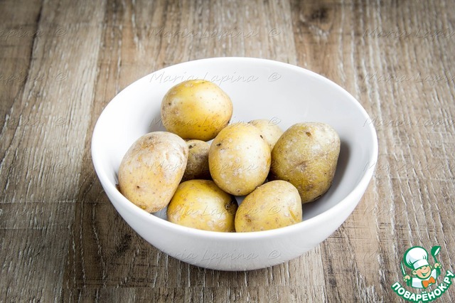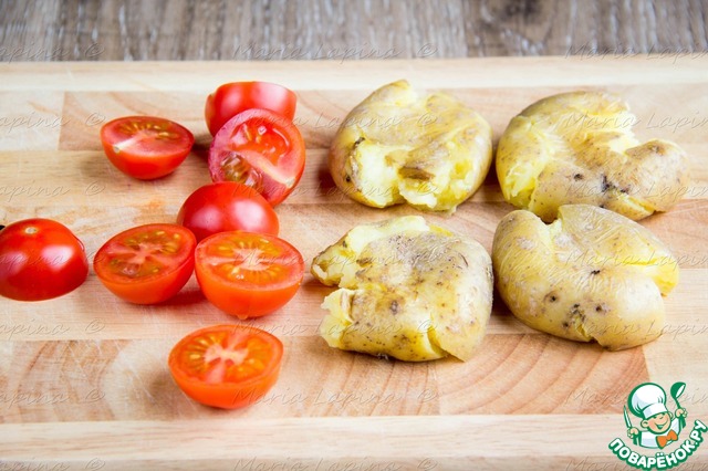 Придавить ладонью готовый картофель, томаты черри рарезать пополам.