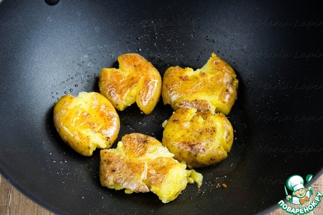 В воке разогреть растительное масло и обжарить сначала картофель до румяной корочки.