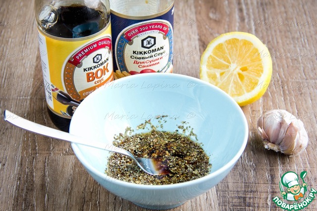Подготовить заправку. Для этого смешать соевый соус, соус ВОК, смесь сухих трав, смесь перцев, чеснок, выдавленный через пресс и лимонный сок.