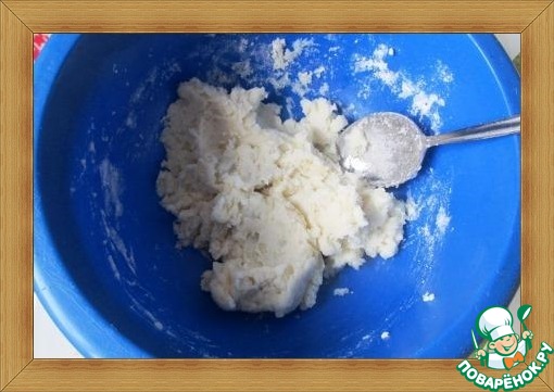 Всыпаем в пюре просеянную муку, перемешиваем, добавляем картофельный отвар до получения теста. Оставляем остыть до теплого.
