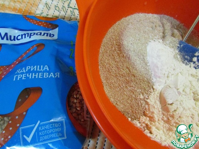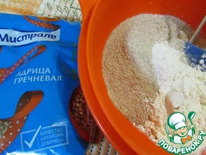 Приготовить гречневую основу. В одну миску добавить гречневую и пшеничную муку.