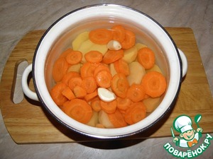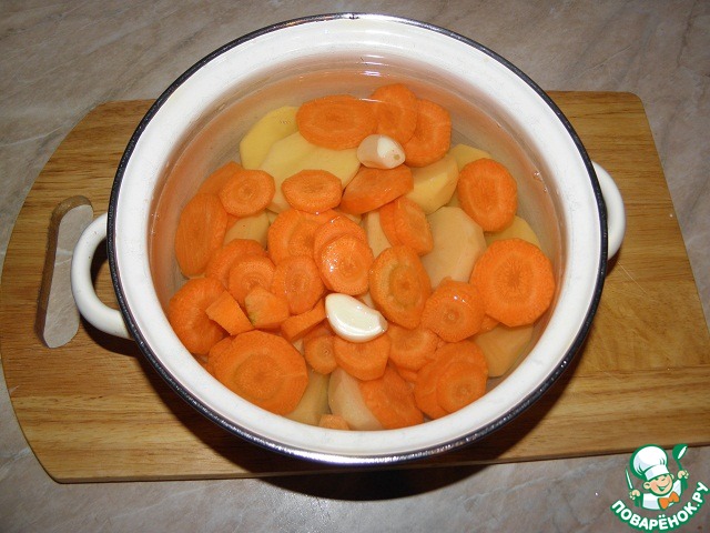 Картофель очистить, разрезать, морковь нарезать шайбами 1-1,5см, чеснок очистить зубчиками, сложить в кастрюлю, залить водой (воды не очень много), довести до кипения, посолить, хорошо разварить до полной готовности
