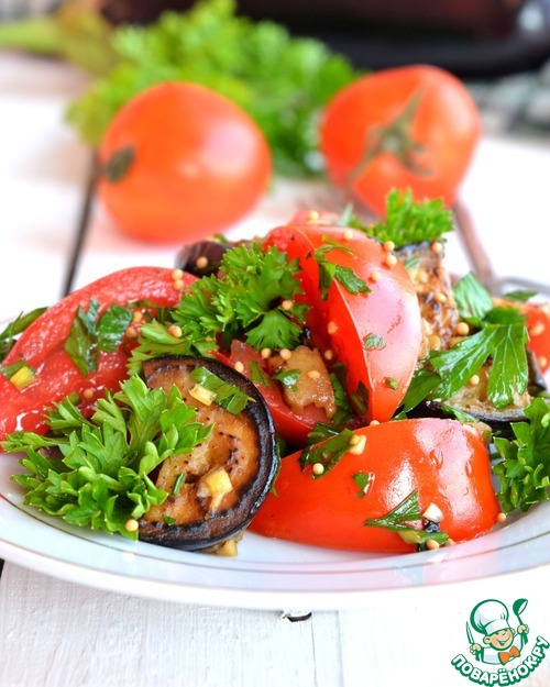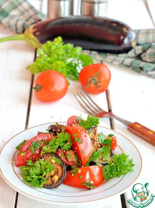 Сочетание обжаренных пикантных баклажанов со свежими помидорами и зеленью - беспроигрышный вариант вкуснейшей закуски!