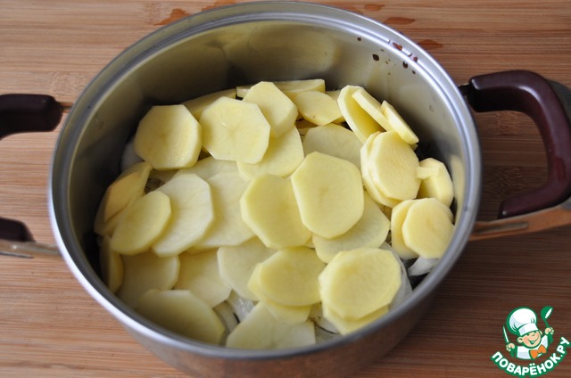 Далее кладём нарезанный тонкими кружками картофель. Заливаем водой, чтобы она доходила до картофеля. Ставим на плиту. Доводим до кипения и при закрытой крышке варим на медленном огне 30 минут.