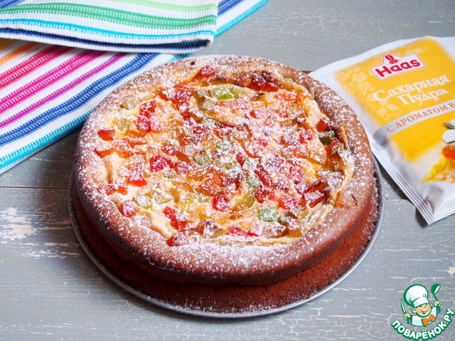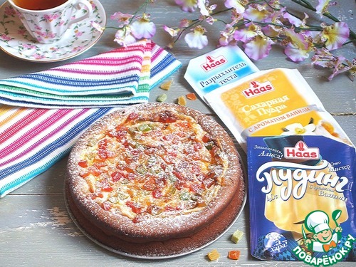 Предлагаю Поварятам рецепт пирога, процесс приготовления которого напоминает "Жидкую ватрушку". В моём варианте начинку из творога я заменила пудингом. Пирог получился очень вкусным, со слегка влажной структурой теста и с нежнейшей начинкой, дополненной цукатами.