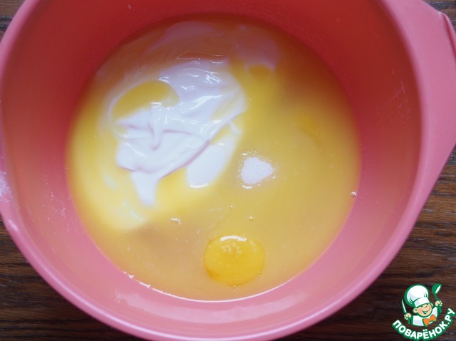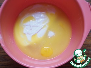 В миску вбить 2 яйца, добавить сахар, щепотку соли, сметану и размягченное сливочное масло. Перемешать.