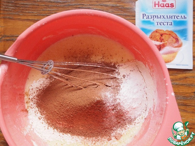 Добавить просеянные муку, разрыхлитель и какао. Перемешать, тесто будет как густая сметана.