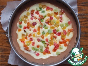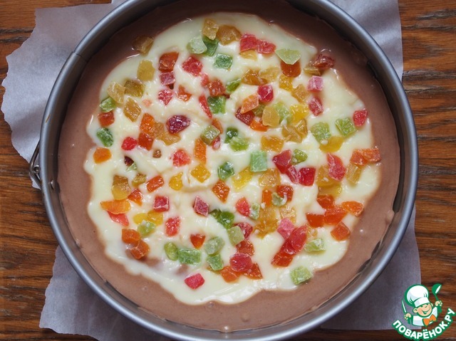 Сверху пудинга распределить цукаты, как бы "утапливая" их в начинке или перемешать их с пудингом заранее. Отправить форму в холодную духовку. Включить на 180 градусов и выпекать минут 35-40. Тесто получится слегка пружинистым.