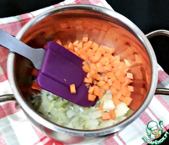 В кастрюле подогреть растительное масло, добавить мелко нарезанный лук и обжарить до мягкости. Затем добавить морковь (нарезанную кубиками) и обжарить 2 минуты.