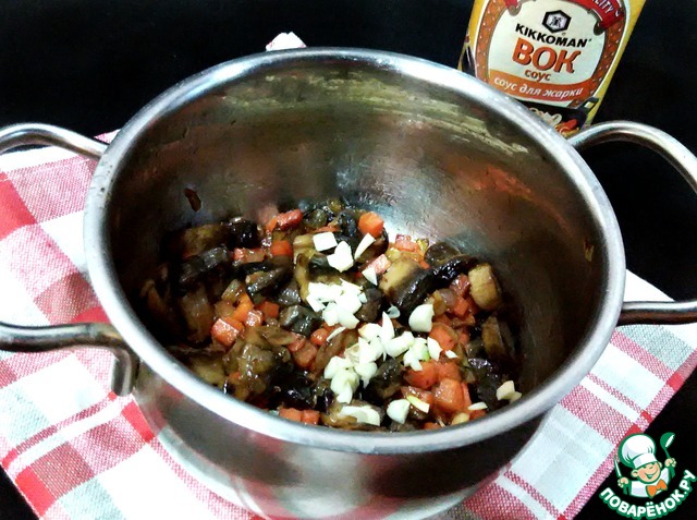 Грибы нарезать небольшими кусочками, чеснок измельчить любым удобным для вас способом (я мелко нарезала). Грибы и чеснок добавить к овощам и обжарить 5 минут.