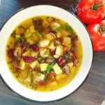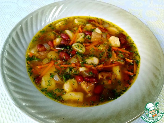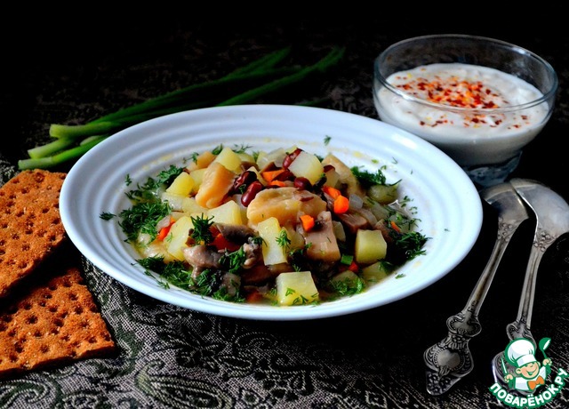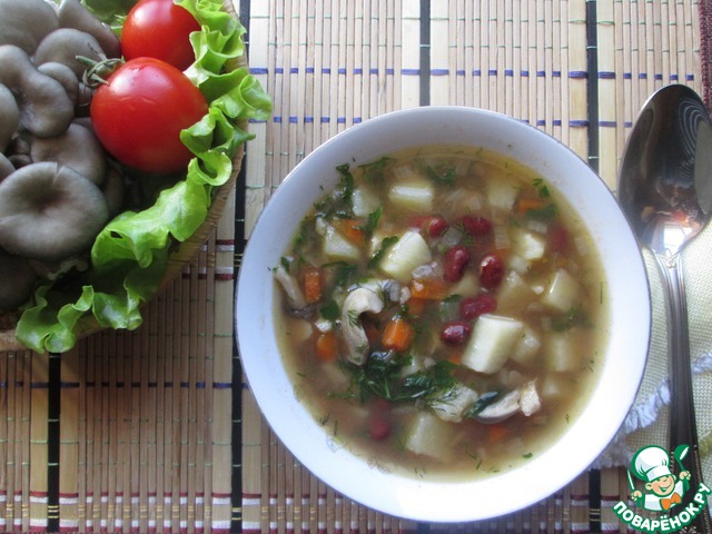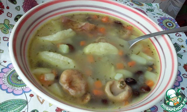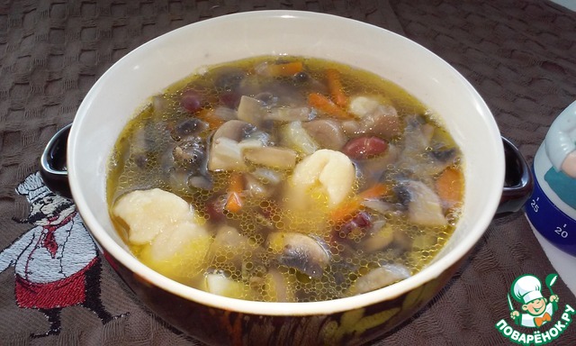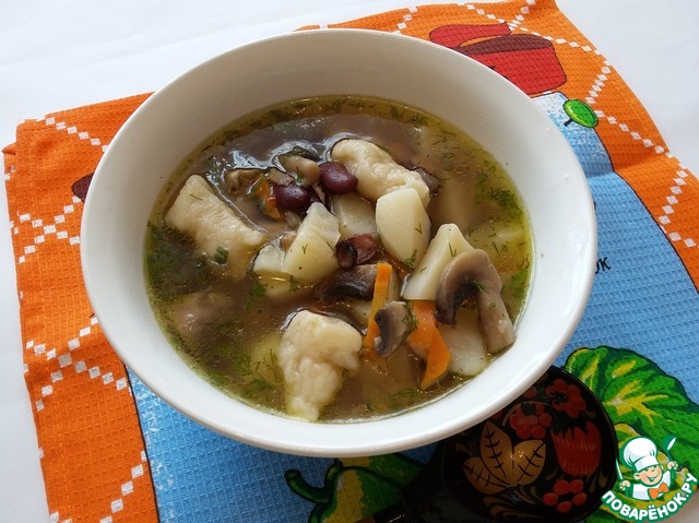 Ароматный, сытный грибной суп с чесночными галушками и фасолью готов. Прошу к столу.