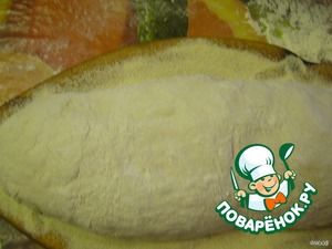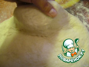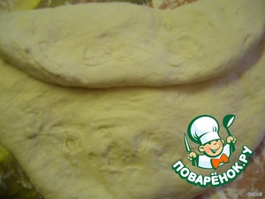 На стол присыпаем немного муки, аккуратно сначала из теста формируем шар, который руками растягиваем легонько на столе в прямоугольник.
