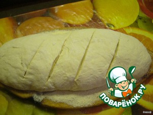 За двадцать минут до выпечки присыпьте багет мукой и сделайте ножом с пилочкой надрезы (глубиной 1-1,5 см), я сделала их поздно, перед посадкой в духовку (дети отвлекли), поэтому мой багет потерял форму.