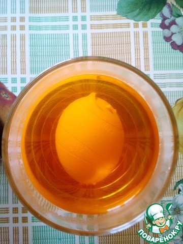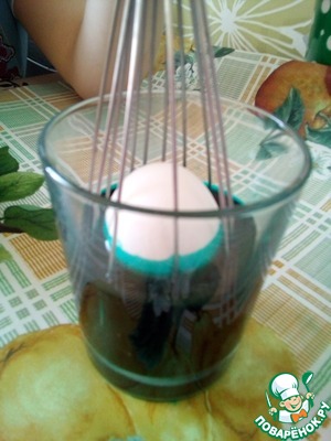 Наполняем стакан красителем примерно на 2-3 см и опускаем наше яйцо.