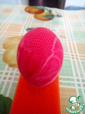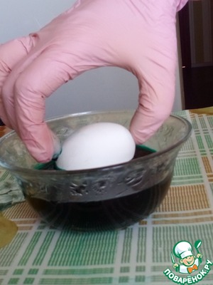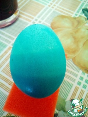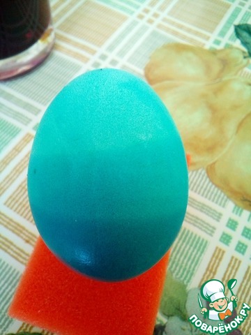 Опускаем яйцо в краситель и вытаскиваем его через 5-7 минут. Промакиваем салфеткой и ставим остудить.