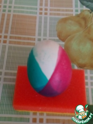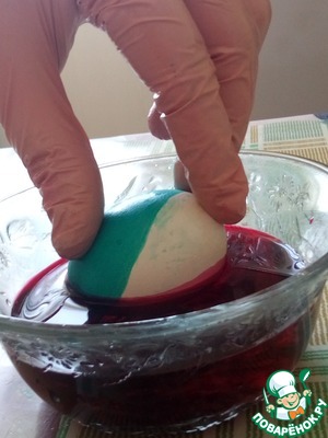 Берем наше яйцо и уже оставшуюся не закрашенную часть опускаем уже в другой краситель.