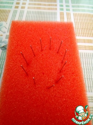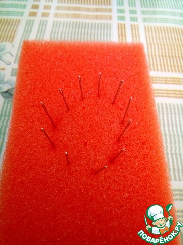 Далее берем губку для посуды и иголки и сооружаем сушку для яиц. Втыкаем иголки, формируя круг.