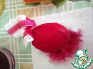 Надеваю обрезок от колготок, туго обтягиваю и завязываю.Теперь опускаю в краску.
