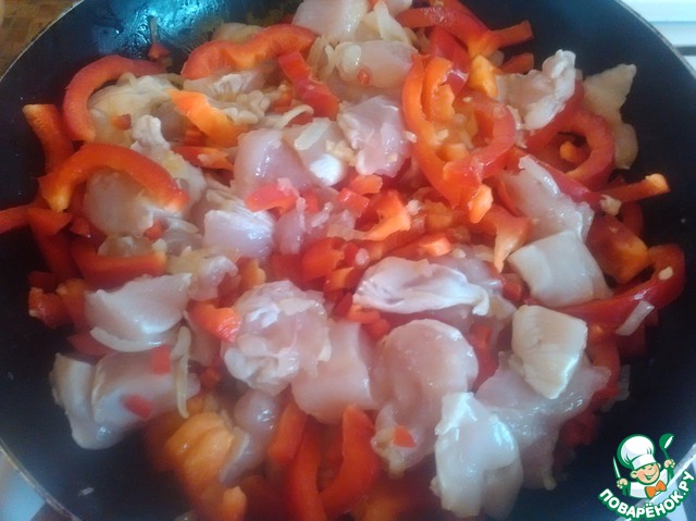 Куриное филе нарезать некрупными кубиками и вместе с перцами добавить к луку с чесноком, обжарить до готовности курицы. Кусочки не должны выглядеть сырыми.