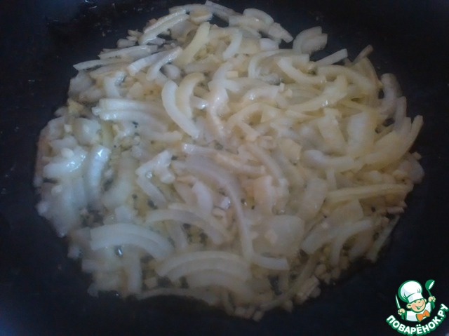 Лук и чеснок нарезать и обжарить на любимом Вами масле. Я жарила на сливочном. К слову, моя подруга все ингредиенты для зажарки обжаривает отдельно. Я жарю все вместе, закладывая по очередно.