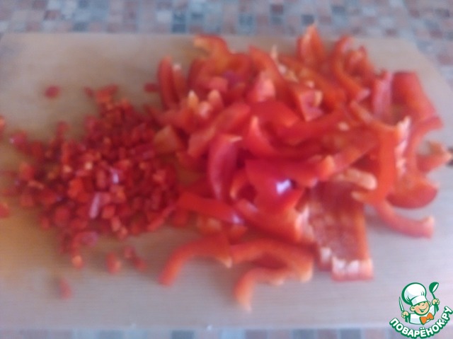 Болгарский перец нарезать соломкой, перец чили мелким кубиком. Если Вы любите "погорячей", добавьте целый перчик чили при варке.