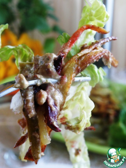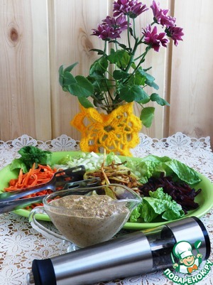 Вкусный и сытный салат из обычных овощей становится изысканным за счет ароматной ореховой заправки, сделанной по мотивам песто и скордоля с добавлением соевых соусов ТМ «Киккоман».