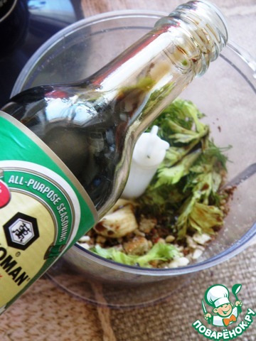 Добавить зелень, запеченный чеснок и влить две ложки легкого соевого соуса ТМ «Киккоман». Пробить до однородности.