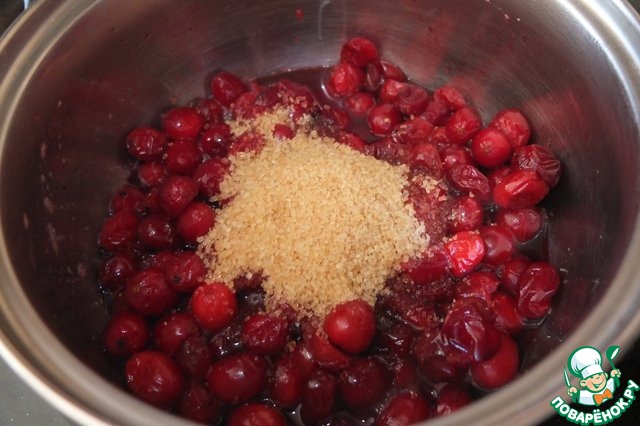 Клюкву (я брала замороженную) нагреваем на небольшом огне. Когда клюква даст сок добавляем 2 ст. л. сахара "Мистраль Демерара", перемешиваем, нагреваем до растворения сахара.