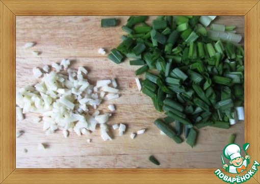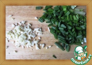 Поскольку делать всё надо быстро, заранее нарезаем зеленый лук и измельчаем чеснок.
