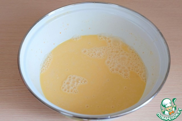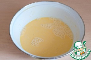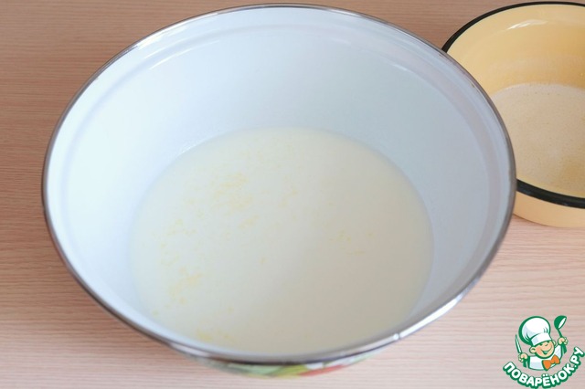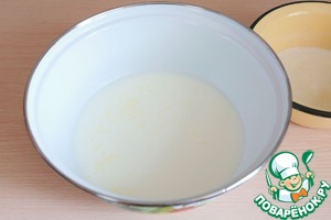 В миску добавить молоко (1,5 стакана), добавить сахар (2 ст. ложки), добавить расплавленное сливочное масло (120 гр.). Смесь слегка подогреть.