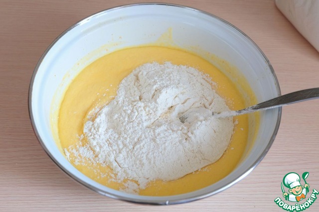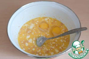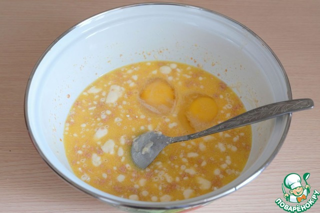 Добавить яйца (2 шт.), дрожжи (10 гр.). Из общего количества муки взять 2 ст. ложки, добавить в молочно-масляную смесь. Смесь хорошо взбить, поставить для роспуска дрожжей.
