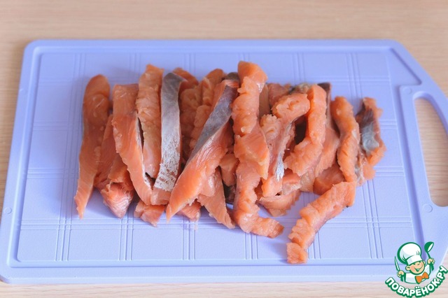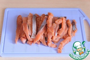 Горбушу почистить, удалить плавники, косточки и кожу. Филе порезать тонкими полосками.