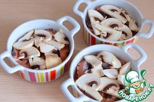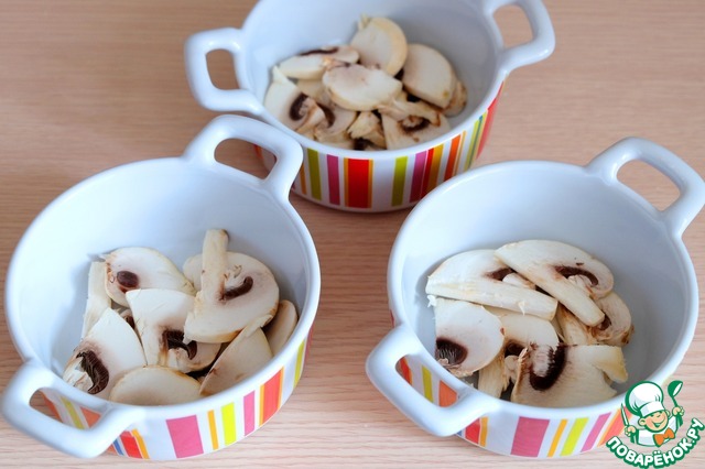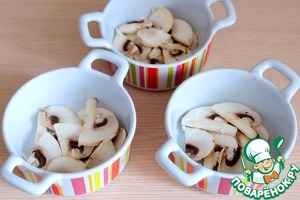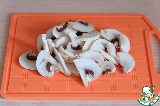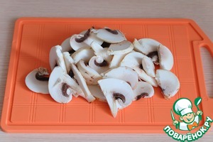 Шампиньоны (6 шт.) порезать тонкими пластинками.