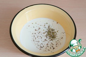 В миску добавить сливки (200 мл.), добавить соль и черный молотый перец по вкусу, добавить смесь прованских трав (1/2 ч. ложки). Смесь размешать.