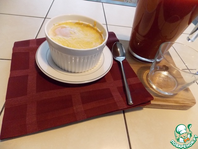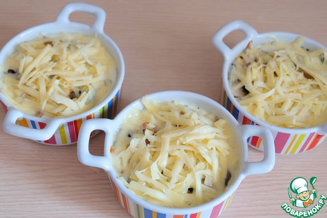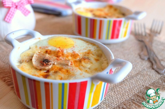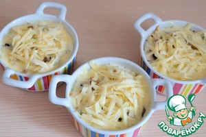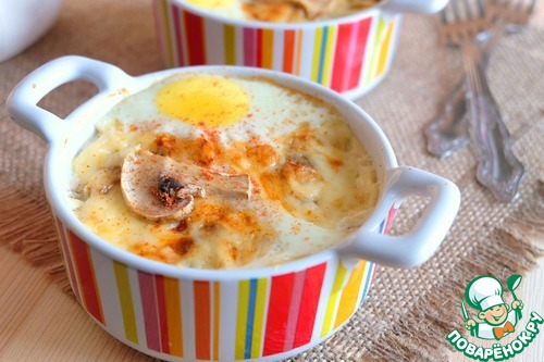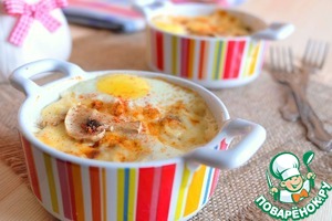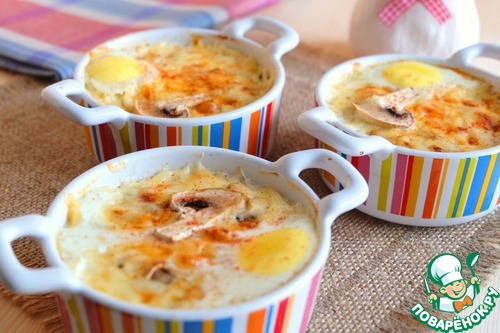 По истечение 15-20 мин. формы достать, посыпать сырной соломкой и вернуть в духовку для доведения блюда до готовности (дополнительное время запекания 10-15 мин.). Затем в каждую из форм добавить перепелиное яйцо, посыпать сладкой паприкой и слегка запечь, можно на гриле.
