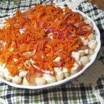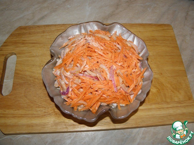 Верхний слой выкладываем морковь с луком, майонез, специи