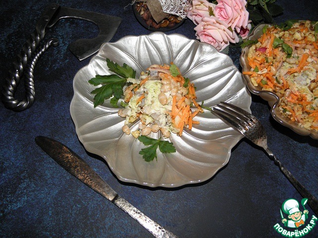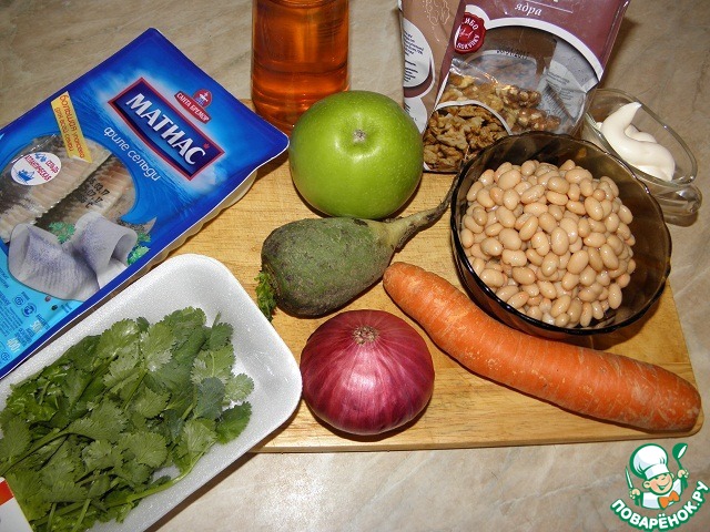 Для поклонников селедки будет наш салат находкой! Необычный очень даже! Витаминный прямо скажем! Замечательный такой! Вкусный, яркий и простой! Редька, яблоко, фасоль! Лук, селедка и морковь! Верх с орехами у нас и кинза тут в самый раз! А когда он настоится, можно и за стол садиться! Аромат невероятный! До того салат приятный!