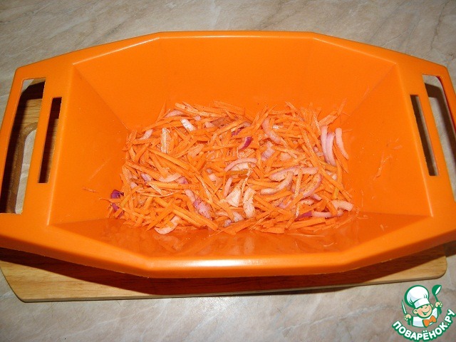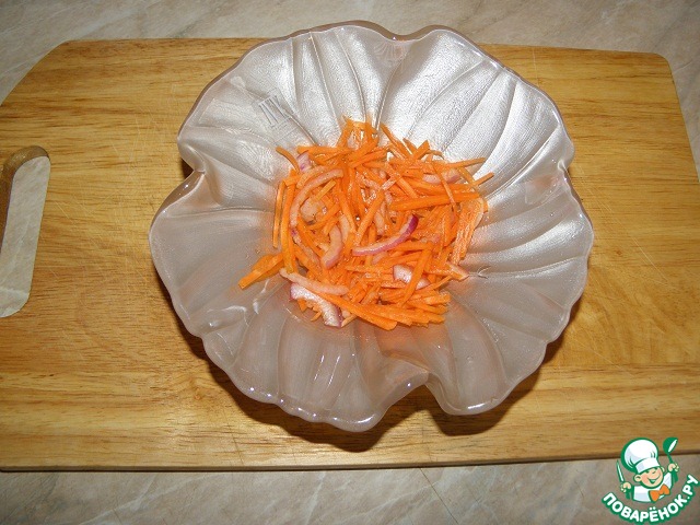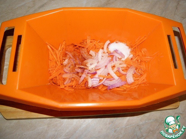 Морковь натереть на терке "по-корейски", лук нарезать тонкими пластинами и выложить к моркови, добавить сахар, паприку, мускат, яблочный уксус