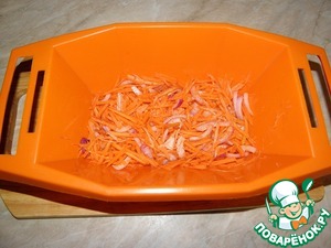 Салатник брать желательно глубокий. Начинаем выкладывать слои: самый нижний слой - морковь с луком посолить, поперчить, смазать тонким слоем майонеза. С солью в салате осторожно, не забывайте про степень солености селедки!