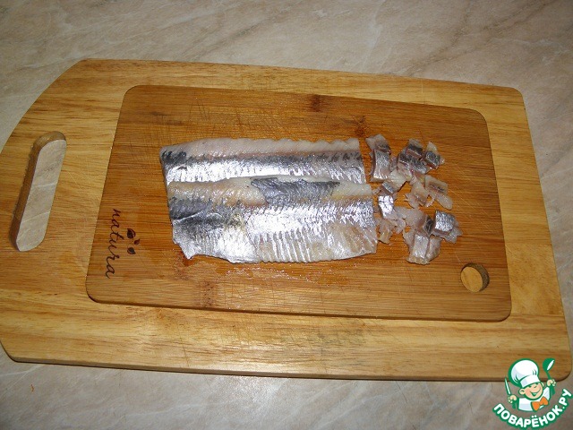 Разделать селедку, у меня уже готовое филе в этот раз, нарезать мелким кубиком