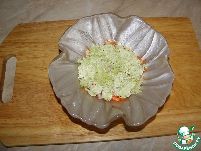 Четвертый слой, яблоко без кожуры натираем на крупной терке, только перчим и смазываем майонезом