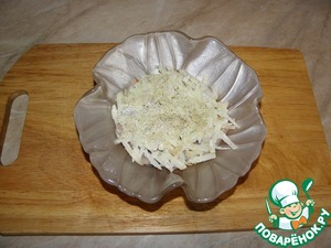Редьку очистить, натереть на мелкой терке, залить кипятком, дать постоять минут 10, слить воду и слегка отжать ( кстати сок можно не выливать, а добавить в него меда и выпить этот чудесный напиток)